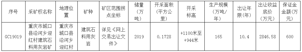 根據(jù)自然資源部《礦業(yè)權(quán)交易規(guī)則》、《重慶市人民政府辦公廳關(guān)于印發(fā)重慶市整合建立統(tǒng)一的公共資源交易平臺實施方案的通知》,現(xiàn)對以下采礦權(quán)予以公告,公告時間為2019年5月7日12:00-2019年6月4日12:00。公告日期內(nèi)有2家以上(含2家)申報的采取拍賣方式確定受讓方,拍賣時間另行通知;公告時間內(nèi)只有1家單位申報的將采取掛牌出讓。本次公開出讓的采礦權(quán)采用網(wǎng)上交易,出讓詳細資料和具體要求,競買申請人可在公告期內(nèi)登錄重慶市公共資源交易網(wǎng)(網(wǎng)址:http://www.cqggzy.com)進入重慶市國有建設(shè)用地使用權(quán)和礦業(yè)權(quán)網(wǎng)上交易系統(tǒng)查閱、下載。地址:重慶市渝北區(qū)青楓北路6號渝興廣場B9、B10棟,聯(lián)系電話:023-63628117,聯(lián)系人:王先生。