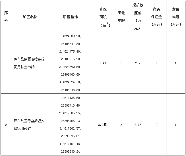 為深化礦產(chǎn)資源有償使用制度改革,培育和規(guī)范采礦權(quán)市場(chǎng),根據(jù)《中華人民共和國(guó)礦產(chǎn)資源法》、《礦產(chǎn)資源開(kāi)采登記管理辦法》、國(guó)土資源部《探礦權(quán)采礦權(quán)招標(biāo)拍賣(mài)掛牌管理辦法(試行)》等規(guī)定,新疆阿克蘇地區(qū)國(guó)土資源交易中心受阿克蘇地區(qū)國(guó)土資源局委托對(duì)下列采礦權(quán)以掛牌拍賣(mài)方式公開(kāi)出讓?zhuān)F(xiàn)將有關(guān)事項(xiàng)公告如下: