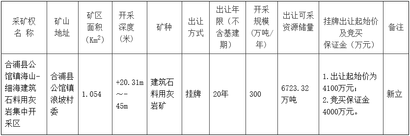 根據(jù)《中華人民共和國(guó)礦產(chǎn)資源法》、《國(guó)土資源部關(guān)于印發(fā)礦業(yè)權(quán)交易規(guī)則的通知》(國(guó)土資規(guī)〔2017〕7號(hào))、《廣西壯族自治區(qū)礦業(yè)權(quán)交易管理暫行辦法》(桂政辦發(fā)〔2012〕11號(hào))等有關(guān)法律法規(guī)政策規(guī)定,經(jīng)北海市人民政府批準(zhǔn),我局委托北海市地產(chǎn)交易中心以掛牌方式公開出讓一個(gè)礦區(qū)的采礦權(quán)?,F(xiàn)將有關(guān)事項(xiàng)公告如下: