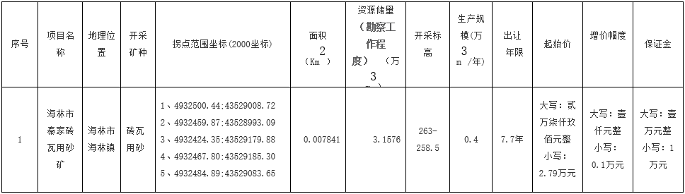 依據《中華人民共和國礦產資源法》、《礦產資源開采登記管理辦法》(中華人民共和國國務院令第241號)、《探礦權采礦權招標拍賣掛牌管理辦法(試行)》(國土資發(fā)〔2003〕197號)、《礦業(yè)權交易規(guī)則》(國土資規(guī)〔2017〕7號)等有關規(guī)定,擬以掛牌方式公開出讓海林市秦家磚瓦用砂礦采礦權。現將有關事項公告如下: