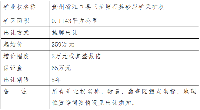 銅仁市公共資源交易中心江口分中心受江口縣國土資源局委托,對(duì)貴州省江口縣三角塘石英砂巖礦采礦權(quán)進(jìn)行網(wǎng)上公開掛牌出讓?,F(xiàn)將有關(guān)事項(xiàng)公告如下: