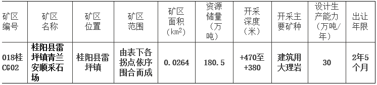 根據(jù)《中華人民共和國礦產(chǎn)資源法》、國土資源部關(guān)于印發(fā)《礦業(yè)權(quán)交易規(guī)則》(國土資規(guī)〔2017〕7號)的通知和《國土資源部關(guān)于完善礦產(chǎn)資源開采審批登記管理有關(guān)事項(xiàng)的通知》(國土資規(guī)〔2017〕16號)和《湖南省人民政府辦公廳關(guān)于印發(fā)〈湖南省礦業(yè)權(quán)招標(biāo)拍賣掛牌出讓管理辦法〉的通知》(湘政辦發(fā)〔2016〕65號)等有關(guān)規(guī)定,經(jīng)桂陽縣人民政府批準(zhǔn)同意,我局決定在湖南省國土資源網(wǎng)上交易系統(tǒng)(以下簡稱“網(wǎng)掛系統(tǒng)”)(http://www.hngtjy.com)以掛牌方式出讓以下礦區(qū)采礦權(quán),并委托桂陽縣國土資源產(chǎn)權(quán)交易中心承辦具體事宜?,F(xiàn)將有關(guān)事項(xiàng)公告如下: