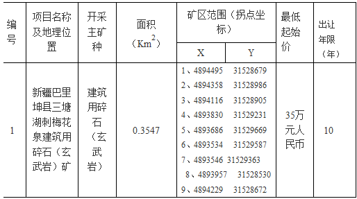 為深化礦產(chǎn)資源有償使用制度改革,培育和規(guī)范采礦權(quán)市場,根據(jù)《中華人民共和國礦產(chǎn)資源法》、《礦產(chǎn)資源開采登記管理辦法》、國土資源部《探礦權(quán)采礦權(quán)招標(biāo)拍賣掛牌管理辦法(試行)》等有關(guān)規(guī)定,哈密地區(qū)國土資源局委托哈密地區(qū)土地礦產(chǎn)資源儲備交易中心對下列采礦權(quán)以掛牌方式公開出讓?,F(xiàn)將有關(guān)事項公告如下: