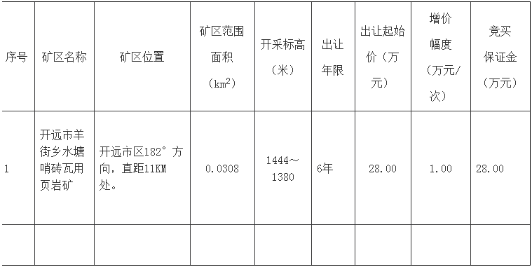根據(jù)國土資源部《礦業(yè)權(quán)交易規(guī)則》以及《云南省探礦權(quán)采礦權(quán)管理辦法》和《云南省礦業(yè)權(quán)交易辦法》的規(guī)定,受開遠(yuǎn)市國土資源局委托,紅河州公共資源交易中心擬對開遠(yuǎn)市羊街鄉(xiāng)水塘哨磚瓦用頁巖礦采礦權(quán)進(jìn)行掛牌出讓,現(xiàn)將有關(guān)事項(xiàng)公告如下: