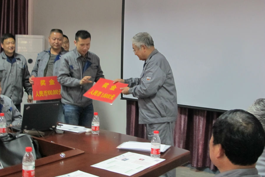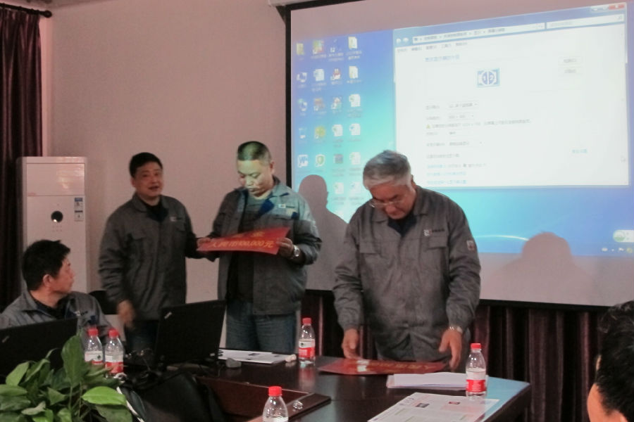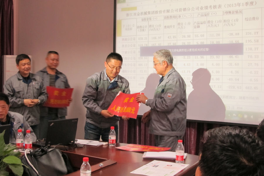 會議開始,首先對本季度各部門工作所取得的成績給予了充分肯定,并鼓勵大家再接再厲,爭取下季度再創(chuàng)佳績。在隨后各分公司代表的匯報中,華南胡總講到的會議營銷模式引起了大家的關(guān)注和討論;總部業(yè)務(wù)員代表姜洪平提到他目前業(yè)務(wù)情況:舟山、臺州各有兩條生產(chǎn)線要做,附近蕭山有一條生產(chǎn)線要做,這一良好的市場形勢為我們鼓足了信心和勇氣。期間,最讓大家振奮和激動的是董事長親自為本季度銷售前三甲頒發(fā)現(xiàn)金獎勵。
