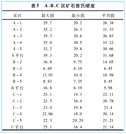 如表 5 所示新工作面礦石普氏硬度,結(jié)合巖石堅固性等級分類分析,A 工作面礦石的普氏硬度系數(shù) f 值平均達(dá) 31. 7,最大值 39. 3,最小值 20. 2,礦石硬度極大; B 開采平臺礦石普氏硬度系數(shù) f 平均10. 0,最大值 16. 8,最小值 6. 2,屬于堅固礦石。C開采平臺礦石普氏硬度系數(shù) f 平均 21. 1,最大值25. 1,最小值 16. 4,礦石硬度大。A 和 C 工作面礦石的普氏硬度系數(shù)幾乎都在 20 以上,甚至有些礦石達(dá)到 30 以上,大大超過普氏堅固性分級表最大值20,屬于極堅硬礦石。