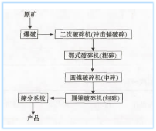該客戶年產(chǎn) 400 多萬噸砂石料,采用工藝為三段破碎及濕法篩分(如下圖所示)。爆破開采的毛料,先經(jīng)沖擊錘初步破碎后,再經(jīng)顎式破碎機(jī)粗碎、圓錐破碎機(jī)中碎和細(xì)碎。三段破碎后的產(chǎn)物經(jīng)分級后得到不同規(guī)格的建筑骨料及機(jī)制砂等產(chǎn)品。