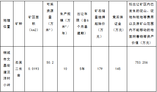 1、安徽省桐城市文昌街道汪洋村小嶺建筑石料用石英二長巖礦采礦權(quán)掛牌出讓具體事宜委托桐城市公共資源交易中心主辦,桐城市國土資源局協(xié)辦。