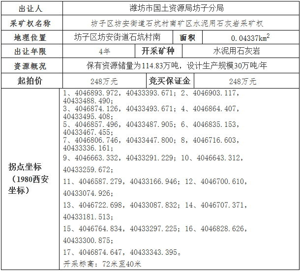 根據(jù)《中華人民共和國礦產(chǎn)資源法》、國土資源部《礦業(yè)權(quán)交易規(guī)則》、濰坊市人民政府辦公室《關(guān)于實行國有建設(shè)用地使用權(quán)、礦業(yè)權(quán)招拍掛出讓網(wǎng)上交易的通知》(濰政辦〔2012〕50號)要求,濰坊市國土資源局、濰坊市公共資源交易中心對坊子區(qū)坊安街道石坑村南礦區(qū)水泥用石灰?guī)r采礦權(quán)進行公開出讓。現(xiàn)將有關(guān)事項公告如下: