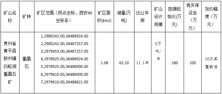 經(jīng)州人民政府同意,由黔東南州國土資源局委托黔東南州公共資源交易中心公開掛牌出讓以下采礦權(quán)?,F(xiàn)將有關(guān)事項公告如下: