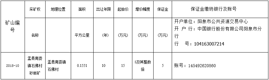 六、 本次采礦權(quán)掛牌活動在陽泉市公共資源交易中心進行。掛牌時間為:2018年10 月10日9時00分至 2018年10月23日9時00分。
