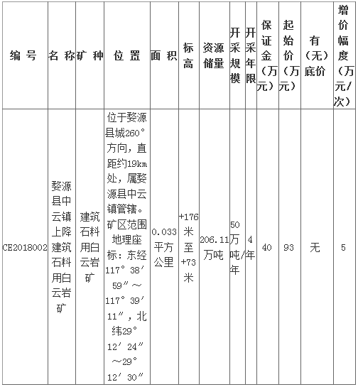根據(jù)《江西省土地使用權(quán)和礦業(yè)權(quán)統(tǒng)一網(wǎng)上交易管理辦法》等有關(guān)規(guī)定,受婺源縣國土資源局委托,上饒市國土資源市場交易管理所以網(wǎng)上掛牌方式出讓下列礦業(yè)權(quán)。