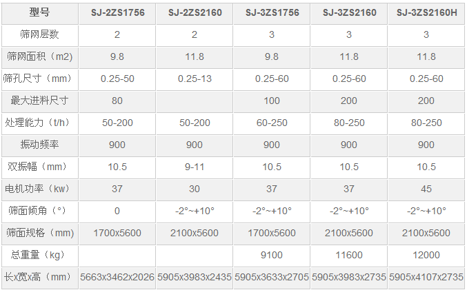 直線振動篩可用于選礦、選煤、電力、冶煉、建材及化工等行業(yè)。雙金ZS系列水平式直線篩具有處理量大、篩分效率高、防粘防堵、使用壽命長等特性。同時具有雙重功能,應用廣泛,不僅可以作為圓振動篩對各類規(guī)格物料對進行篩分分級,而且還可作為直線篩對中細粒物料進行干、濕式分級、脫水、脫介和脫泥,特別對濕性物料,具有更好的脫水效果。雙金直線篩技術參數(shù)如下圖:
